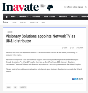 Santa Barbara, CA – August 2020… Visionary Solutions, a leader in high-quality network AV solutions, announced the appointment of NetworkTV as the company’s distributor for the United Kingdom and Ireland.